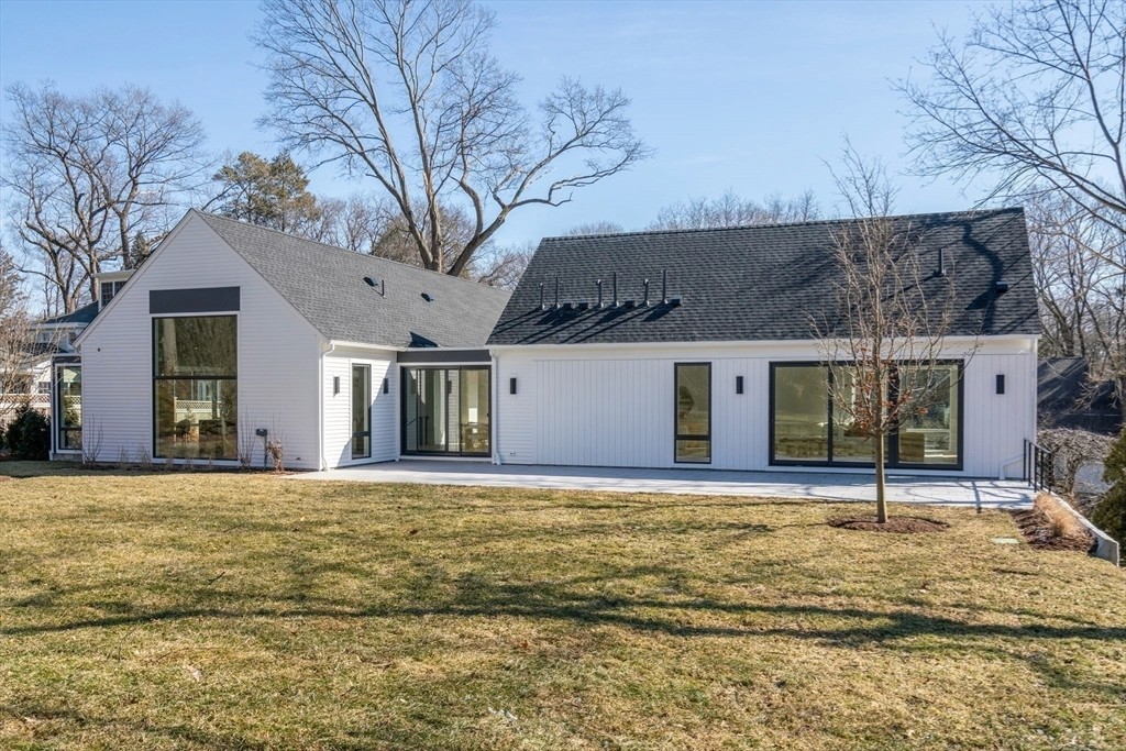 Situated at the site’s upper grade, the rear elevation features a spacious terrace connecting the home’s distinct volumes. Large sliding glass walls open the living spaces directly to the expansive lawn, ensuring a seamless indoor-outdoor flow for entertaining.
