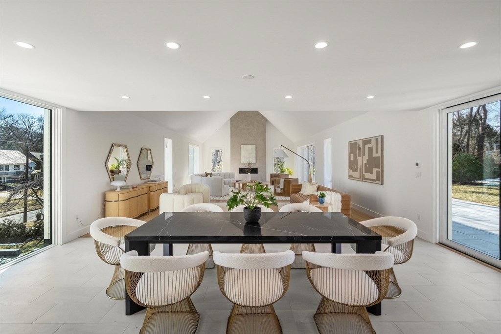 The open-concept plan features a dramatic spatial transition, flowing from the intimate dining zone into a soaring vaulted living volume. Anchored by a textured masonry fireplace, the space is flanked by opposing walls of floor-to-ceiling glass, flooding the interior with light and dissolving the boundaries to the outdoors.