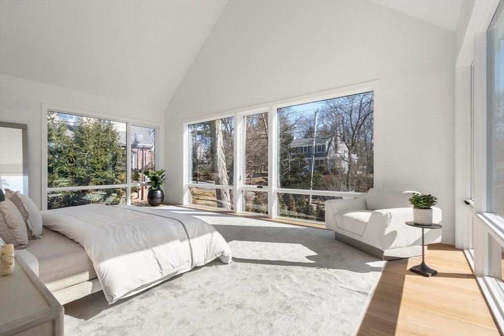 Blending minimalism with natural warmth, the kitchen features built-in, floor-to-ceiling wood cabinetry and a sculptural waterfall island. Large picture windows integrate the lush exterior directly into the culinary space, utilizing the landscape as a vibrant backdrop.