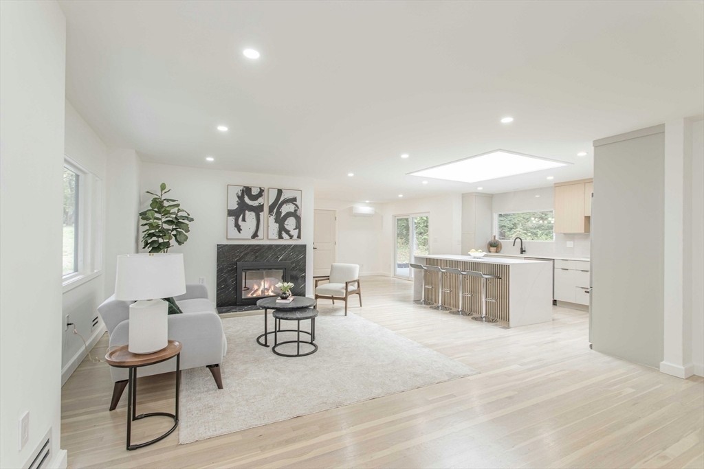 This wide perspective illustrates the dramatic transformation achieved by removing the central load-bearing wall. The living room, anchored by a sleek linear fireplace, now transitions effortlessly into the bright, skylit kitchen, creating a unified and spacious environment for modern living.