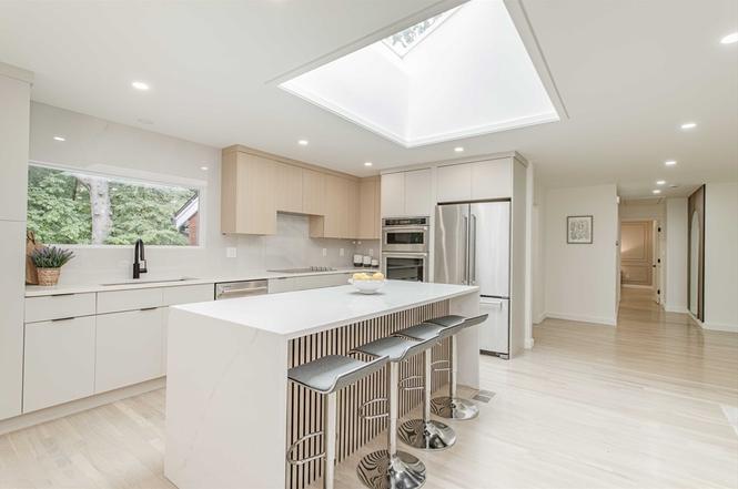 From the vantage point of the kitchen island, the impact of removing the partition wall is clear. The space now flows uninterrupted into the living and dining zones, bathed in natural light from the expansive new skylight overhead, creating a bright and cohesive social hub.